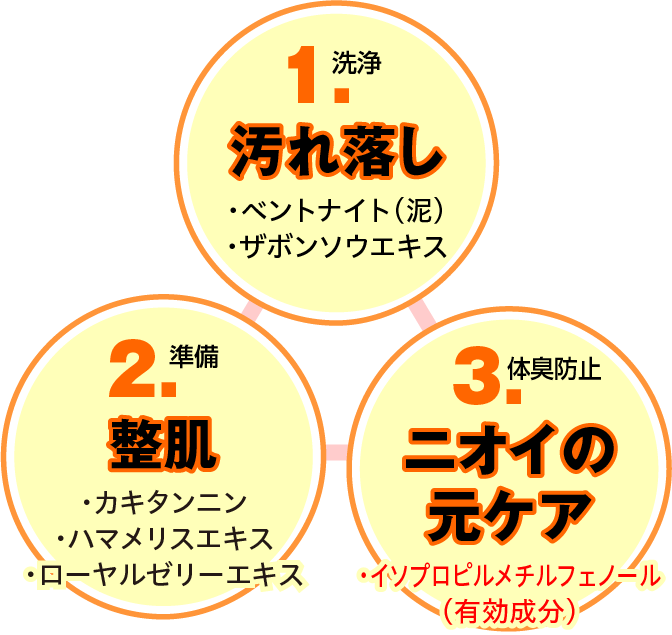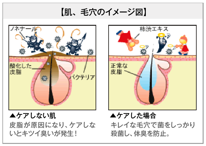 バクテリアなどの菌に、しっかり対応する有効成分。ニオイの原因にしっかりと 対応し、体臭を防ぎます。
