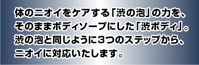 家族みんなで渋の泡石けんを愛用しています。特に 主人は、渋の泡石けんの大ファンで、渋の泡のきめの細かい泡とスッキリ感をとても気に入っているんです。そして今回の「渋ボディ」・・・。「自然な香りも、スッキリした泡切れも、渋の泡と同じで、良いんじゃないか!?」だそうです。でも、「俺はやっぱり石けんだな!」と言っておりました。主人は、ボディソープよりも石けんの方が良いみたい。ちなみに私は手軽なボディソープ派。比べてみるのも良いかもしれませんね。