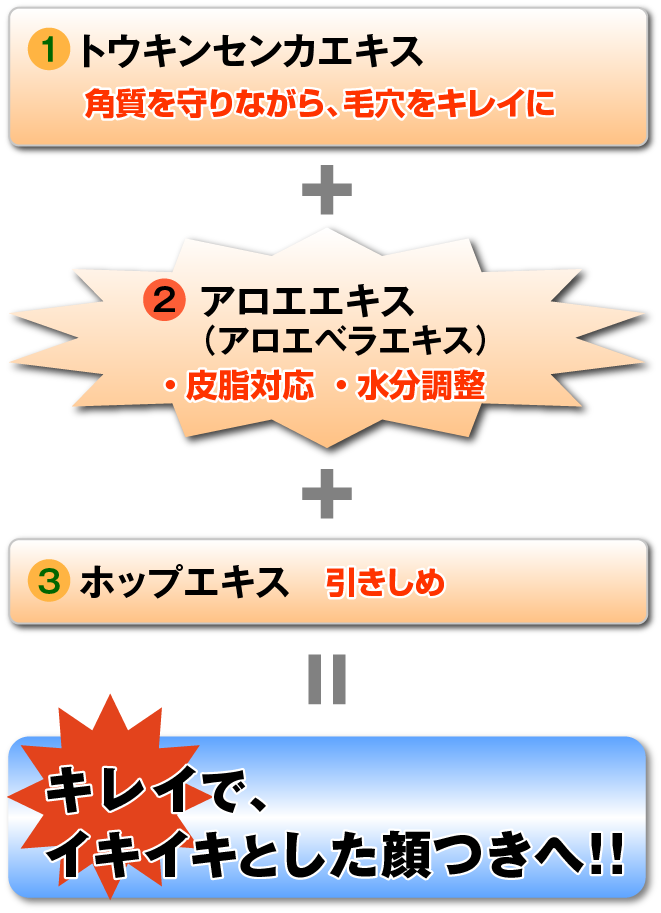 そして他にも、「トウキンセンカエキス」というハーブからの抽出液が、肌の角質を守りながら、毛穴をキレイに。そして、「ホップエキス」というビールでおなじみのホップの穂からの抽出液が、肌トラブルに対応し、肌を整えてくれるのです。