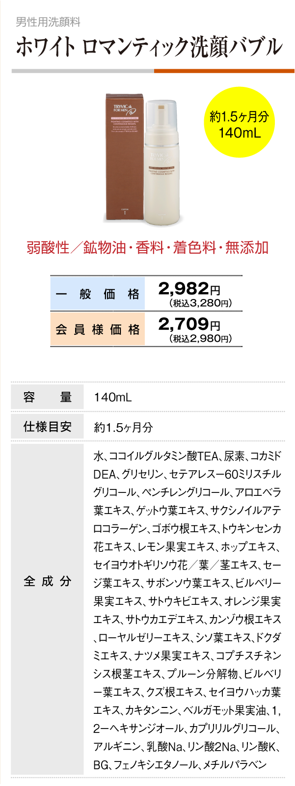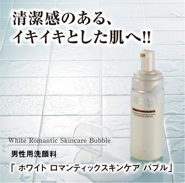 そこに、自然派成分にこだわり、無添加(鉱物油・着色料・香料)にこだわり、弱酸性にこだわり、そして、ついに完成したのが、この男性用洗顔バブル「ホワイト ロマンティック スキンケア バブル」なのです!