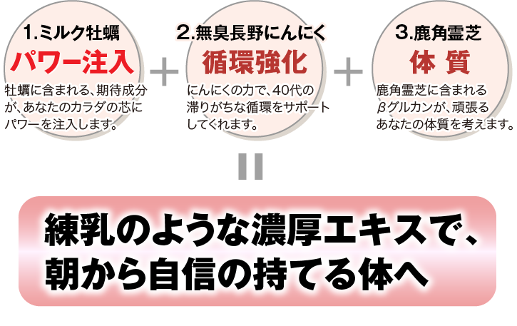 単体でも結果を出す優れた成分が、牡蠣との相性テストをクリアし、選ばれたのです。特にこれに含まれる「βグルガン」が男性の体質を根本から見直してくれるのです。