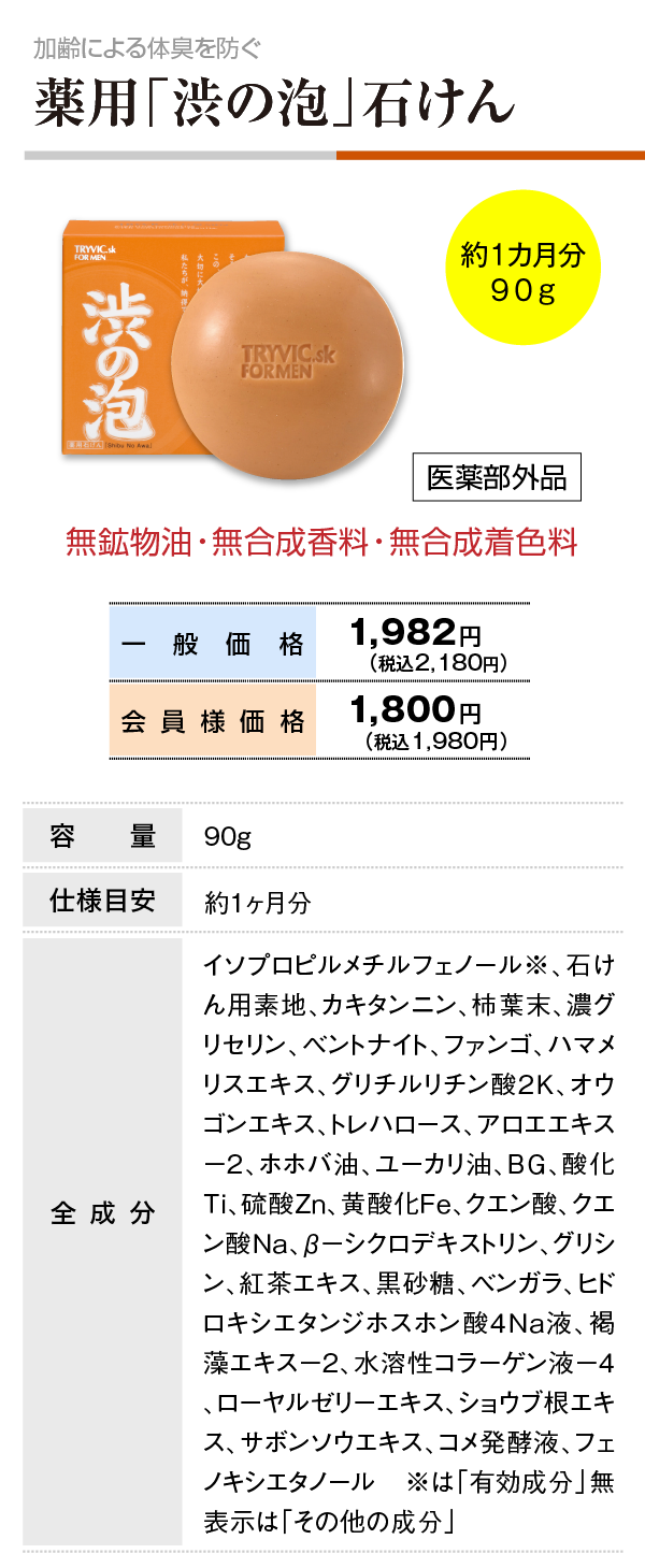 体臭が気になると毎日のように言っていた主人。そんな時に、たまたま見た御社のホームページで、柿渋石けんを知りました。御社には、大変申し訳ないのですが、今までいろいろと試していたので、「たぶん、今回もたいした事ないだろ」と思いつつも良いものと出会いたくて購入してみました。すると…「全然、気にならなくなった!!」と大喜びの主人!!この石けんと出会えてほんとうに良かったと思います。ありがとうございました。